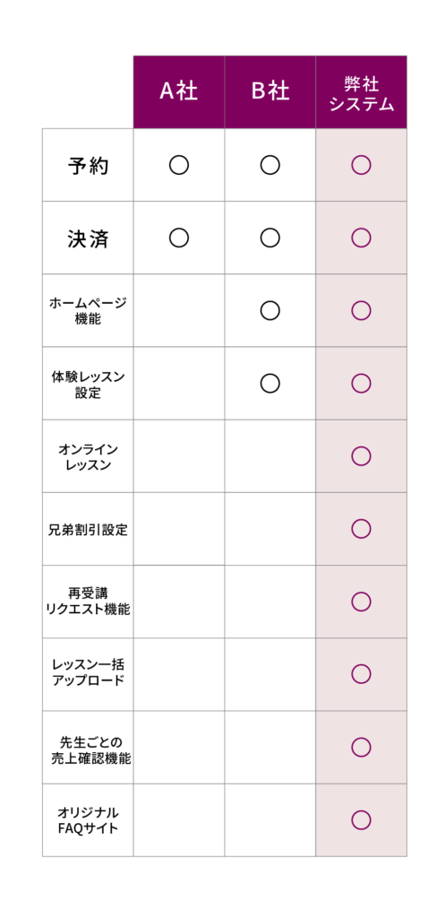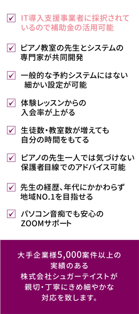 また、ホームページ上でレッスンの予約を行うことができるので、メールでの予約手続き連絡の手間が省けましたし、支払いの確認が自動的に送信されて記録に残るので、教室側は手動での通知作業が省け、生徒様の信用を得られました。特に、補講レッスンでは、