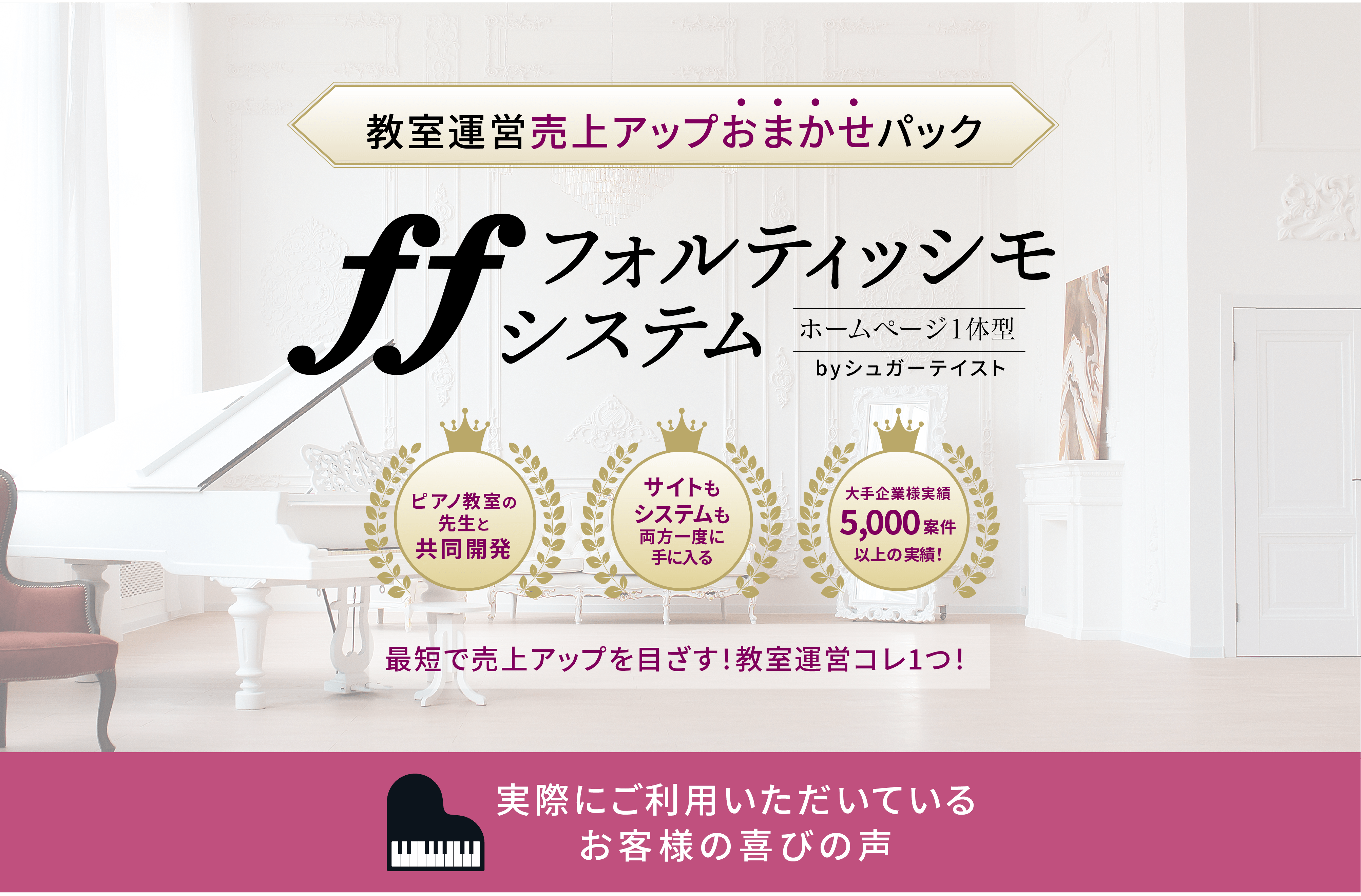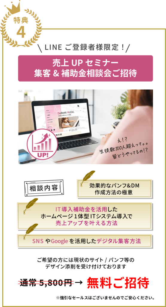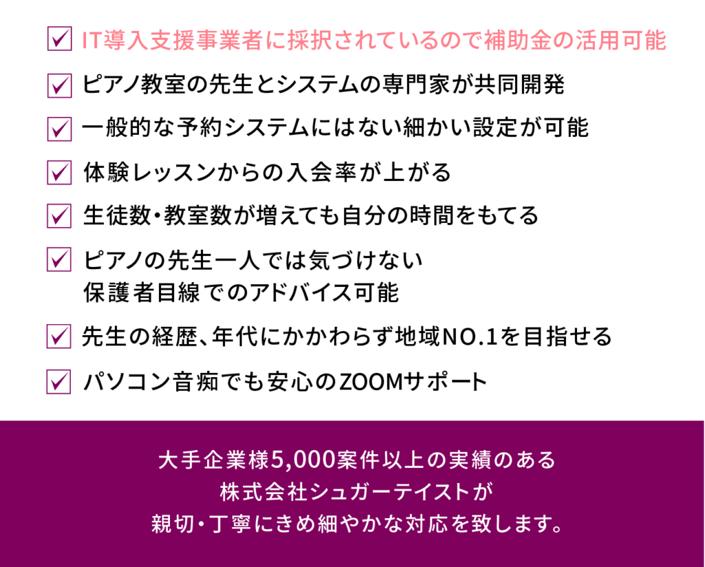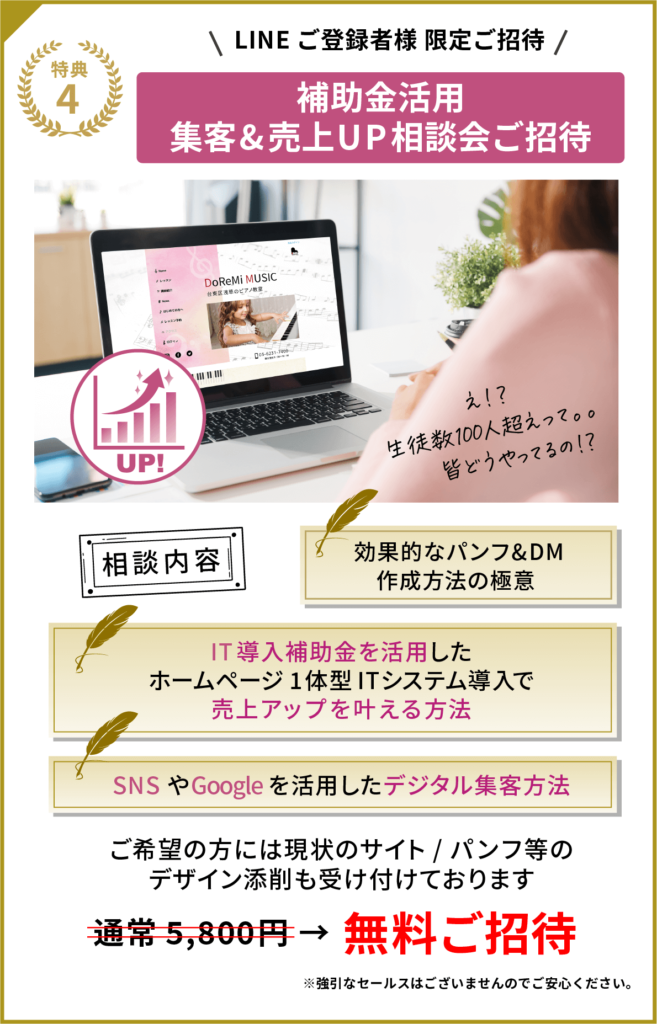 このシステムを取り入れて、順調に運営が進み1ヶ月半でお教室が2つに増えました。さらに、同じシステムを使いお教室をレンタルで使って頂くサービスも開始することができました。ピアノの先生は1名から3名に増え、声楽の先生もお迎えすることができ声楽×英会話の新しいレッスンもスタートしています。入会金システムを活用し、売上は2倍に増えました。特に変わったことはグループレッスンの決済管理が格段に楽になったことです。ウェブサイトがLINEと連動しているので体験レッスンのお手続きや、お問い合わせもスムーズにいただけております。
